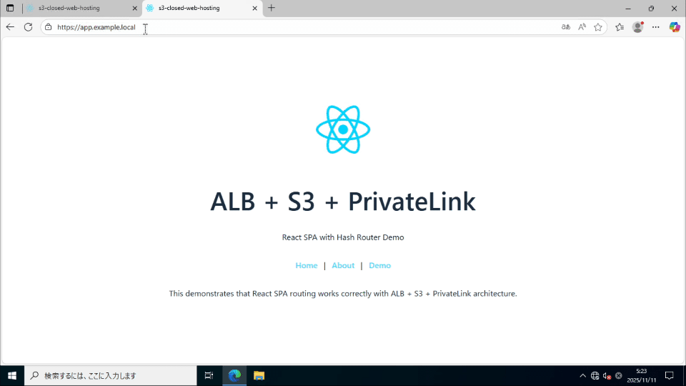 この場合、URL のハッシュを利用したルーティング(React の場合、HashRouter など)を利用することで、トップページ以外へも URL で直接アクセスができるようになります。URL の表示は https://app.example.local/index.html#/about のようになります。