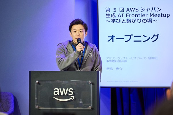 イベントの冒頭では、AWS ジャパン 事業開発統括本部の飯島 恵介がご挨拶をしました。
