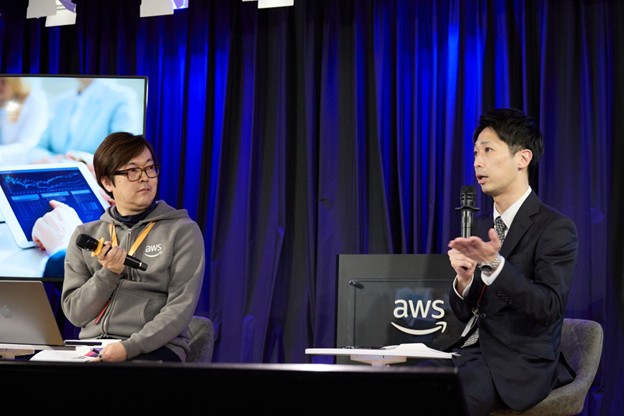 ここからは、生成 AI 実用化推進プログラムに参加する各社の代表者が登壇し、「カスタマー事例 モデル開発」「カスタマー事例 モデル利用」「モデル開発者紹介」の 3 部構成で取り組みを紹介しました。AWS ジャパン シニア フロンティア AI スタートアップ ソリューションアーキテクトの針原 佳貴(写真左)と、AI/ML Specialist SA の飯塚 将太(写真右)がモデレーターを務め、登壇者に質問を投げかけつつ進行しました。