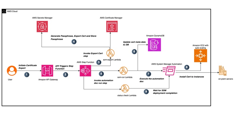 AWS Certificate Manager (ACM) でパブリック証明書のエクスポートが可能になりました。この新機能により、ACM で管理するパブリック TLS 証明書を EC2 インスタンス、Amazon EKS Pod、オンプレミスサーバー、他のクラウドプロバイダーでホストされているサーバーなど、多様な環境で使用できます。本記事では、Amazon EventBridge と AWS Step Functions を活用した証明書のエクスポートと配布の自動化方法、証明書更新時の自動デプロイワークフローの構築手順を紹介します。