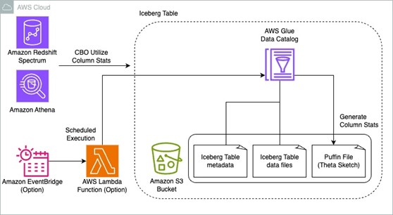 - カラム統計情報を生成: AWS Glue Data Catalog の拡張機能を使用して、各テーブルのカラム統計情報を生成します。Theta Sketch を保存する Puffin ファイルが生成されます。