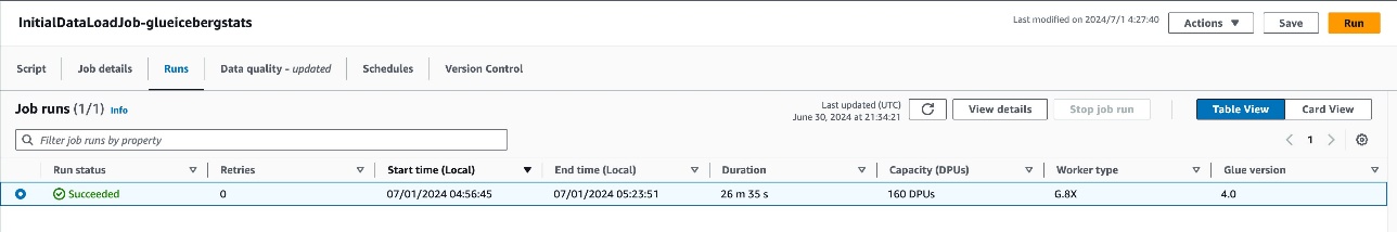 この AWS Glue ジョブの完了には約 30 分かかります。ジョブ処理ステータスが Succeeded と表示されたら、プロセスは完了です。