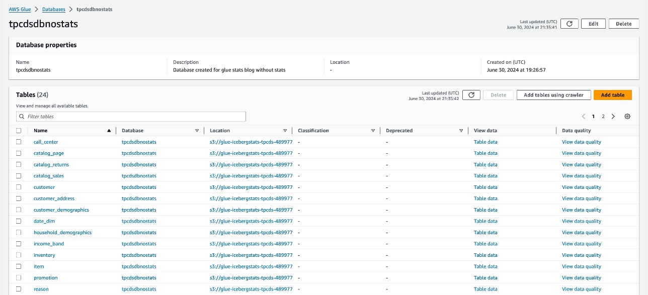 AWS Glue ジョブは、TPC-DS データセットを保存するテーブルを 2 つの同一のデータベース (tpcdsdbnostats と tpcdsdbwithstats) に作成します。tpcdsdbnostats のテーブルには統計情報が生成されず、参照として使用します。tpcdsdbwithstats のテーブルに統計情報を生成します。AWS Glue コンソールでこれら 2 つのデータベースと基盤となるテーブルの作成を確認します。この時点では、これらのデータベースは同じデータを保持しており、テーブルに統計情報は生成されていません。