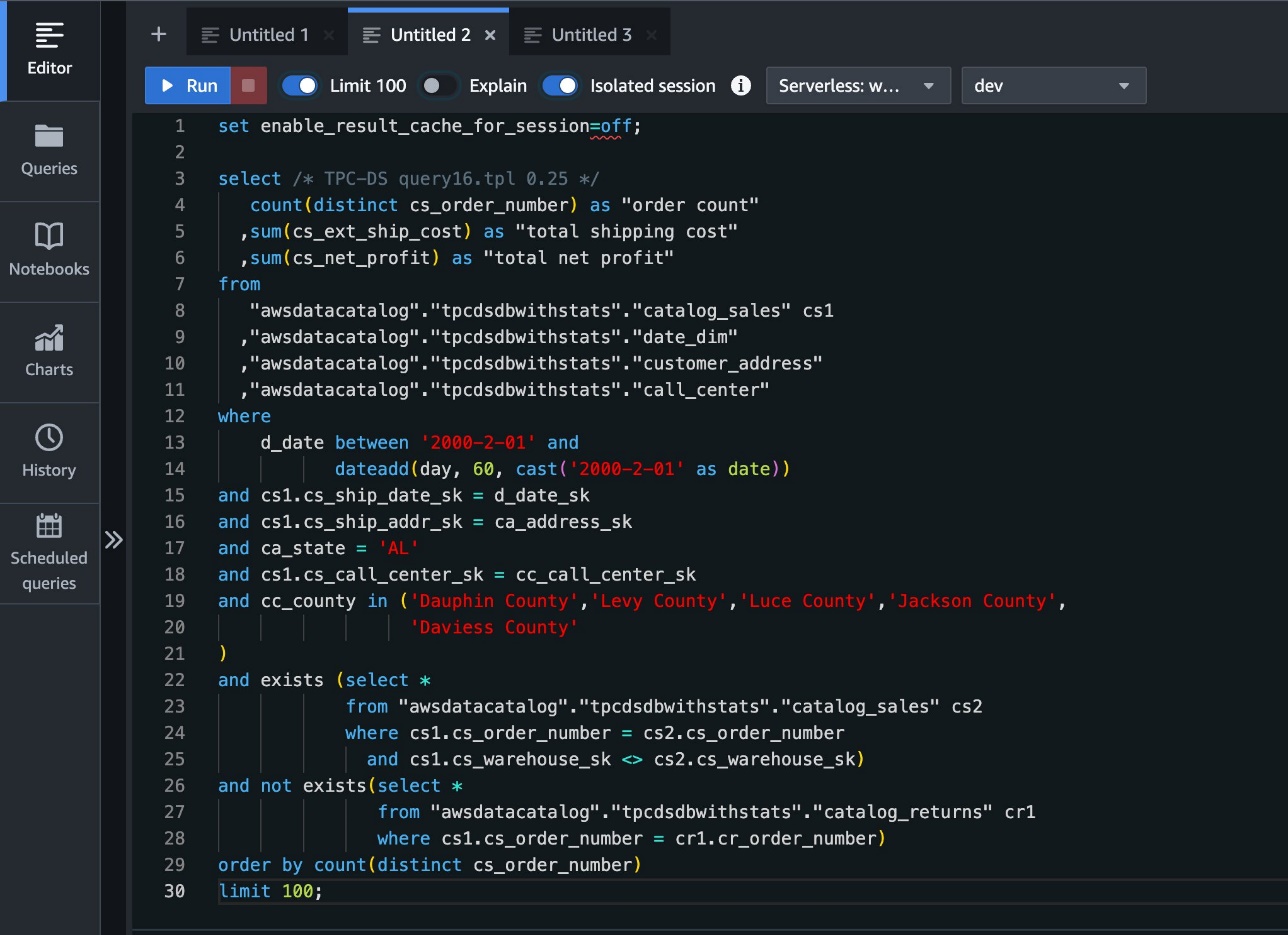 Amazon Athena からも TPC-DS テーブル (現時点では統計情報なし) をクエリしてみましょう。Amazon Athena でクエリを実行するには、以下の手順を完了します: