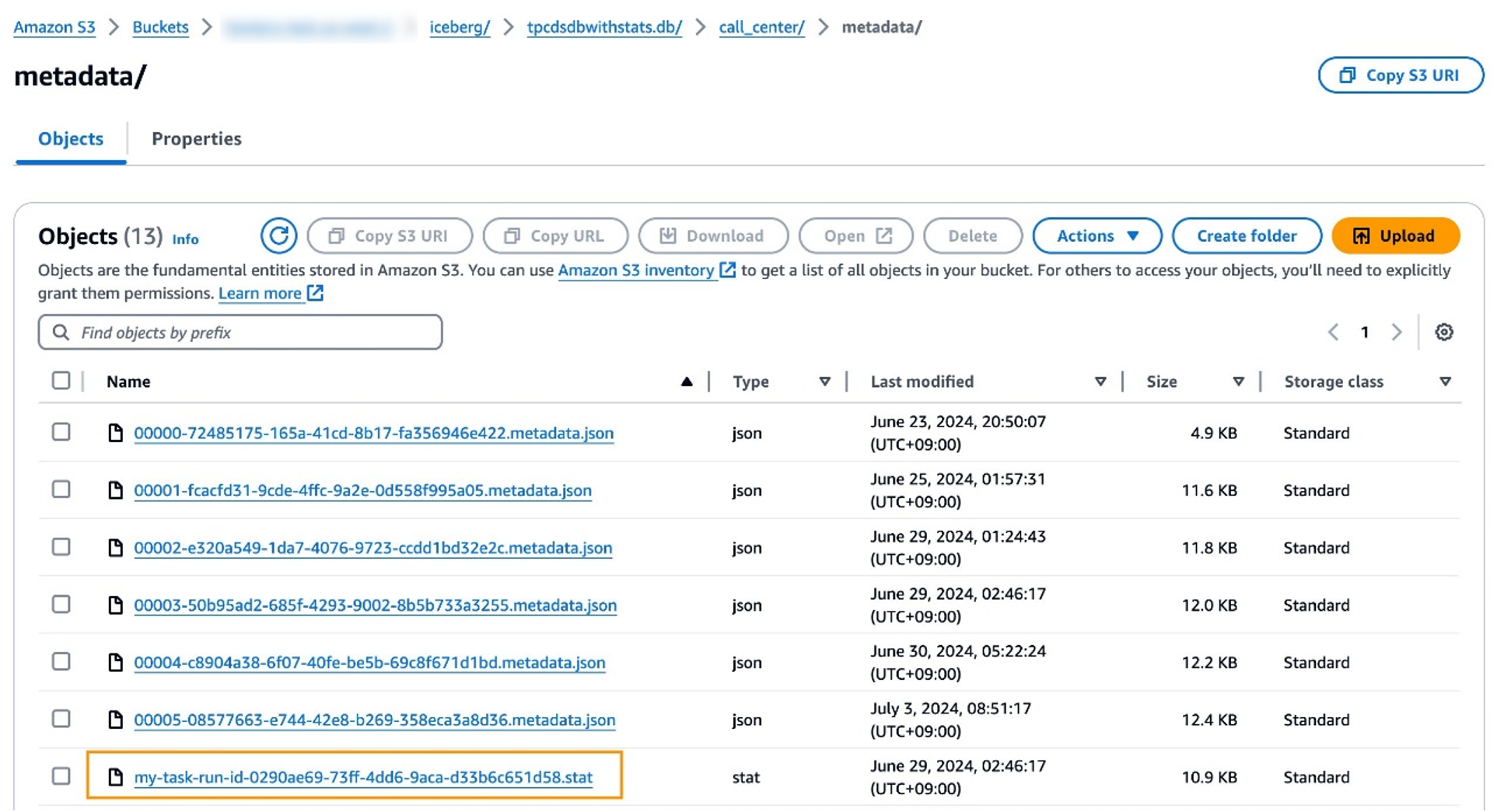 統計情報の生成後、Amazon S3 の AWS Glue テーブルの基盤となるデータの場所に <id>.stat ファイルがあります。このファイルは Theta Sketch データ構造を保存する Puffin ファイルです。クエリエンジンはこの Theta Sketch アルゴリズムを使用して、テーブルを操作する際に NDV を効率的に推定でき、クエリパフォーマンスの最適化に役立ちます。