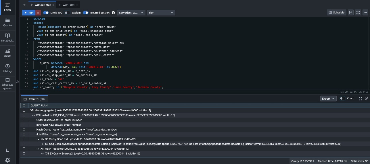 前の手順で、指定された RPU (デフォルトは 128) で Redshift Serverless ワークグループをセットアップし、S3 バケットに TPC-DS 3TB データセットを準備し、Iceberg テーブル (現時点では統計情報なし) を作成しました。