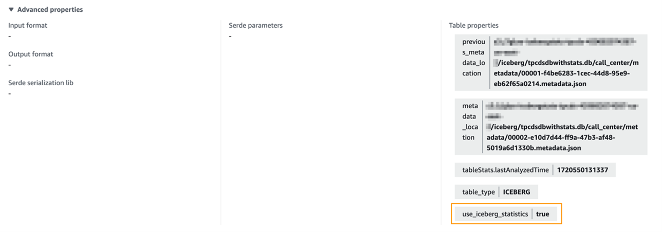 詳細プロパティセクションに、テーブルプロパティ use_iceberg_statistics=true があります。このパラメータは Glue Column Statistics ジョブによって追加されます。Amazon Athena は、これが true に設定されている場合にのみカラム統計情報を利用しようとします。一方、Amazon Redshift は、このパラメータに関係なく、統計情報が利用可能であればデフォルトで利用します。
