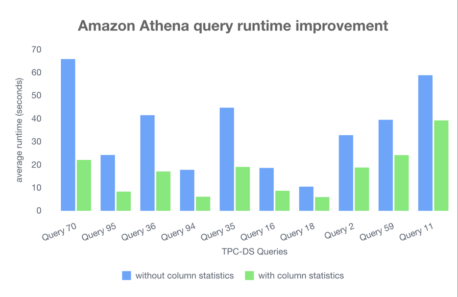 Amazon Athena と TPC-DS 3TB データセットを使用して、NDV 情報が有益であると予想される 10 個の選択された TPC-DS クエリのサンプル実行を行いました。各クエリを 10 回実行しました。以下の表に示す結果は、カラム統計情報を使用したクエリのパフォーマンス改善率でソートされています。