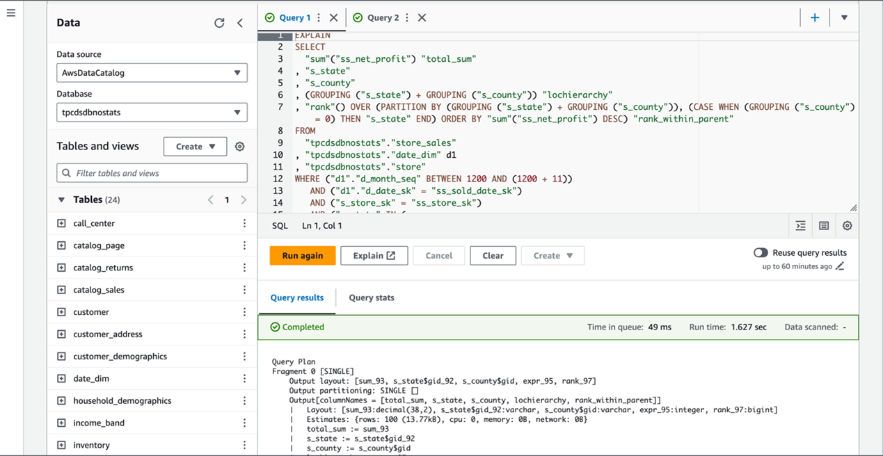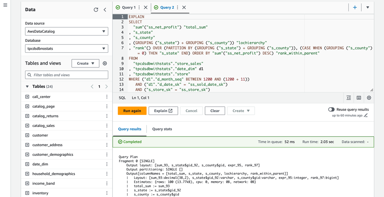 athena-tpcds-sample.sqlの Athena Query for tables without column statistics セクションに記載されているクエリを実行します。 - 各クエリの実行時間を記録します。