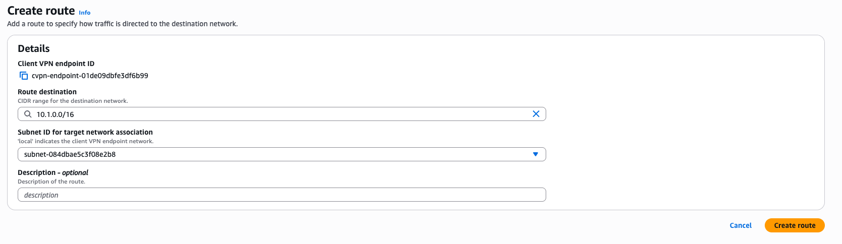 認可ルールを作成すると、ユーザーはその CIDR 範囲にアクセスできるようになります。次に、ネットワークの観点から到達性を提供するため、Client VPN エンドポイントのルートテーブルにエントリを追加します。