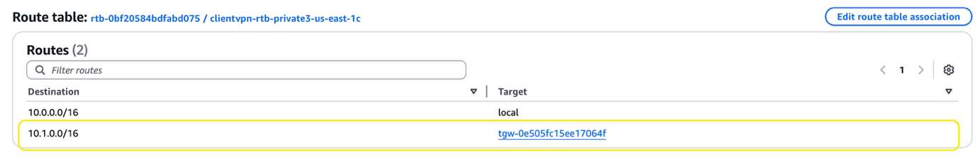 - VPN-VPC では、Client VPN エンドポイントがアタッチされているサブネットにルートを追加します。ルートは Transit Gateway を使用した 10.1.0.0/16 です。このルートにより、VPN ユーザーは Database-VPC に到達できます。