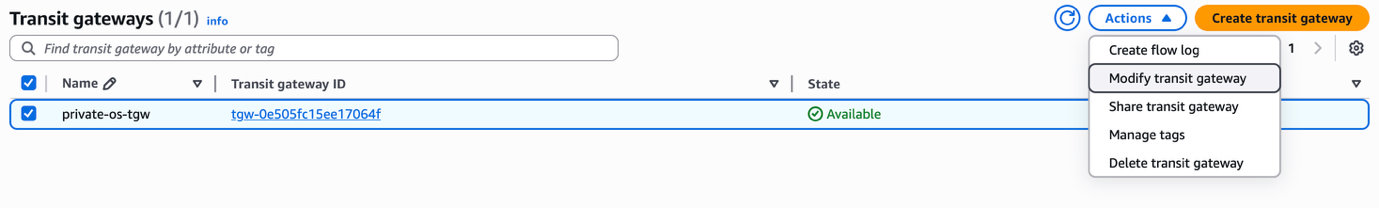 - Actions メニューから Modify transit gateway を選択します。
