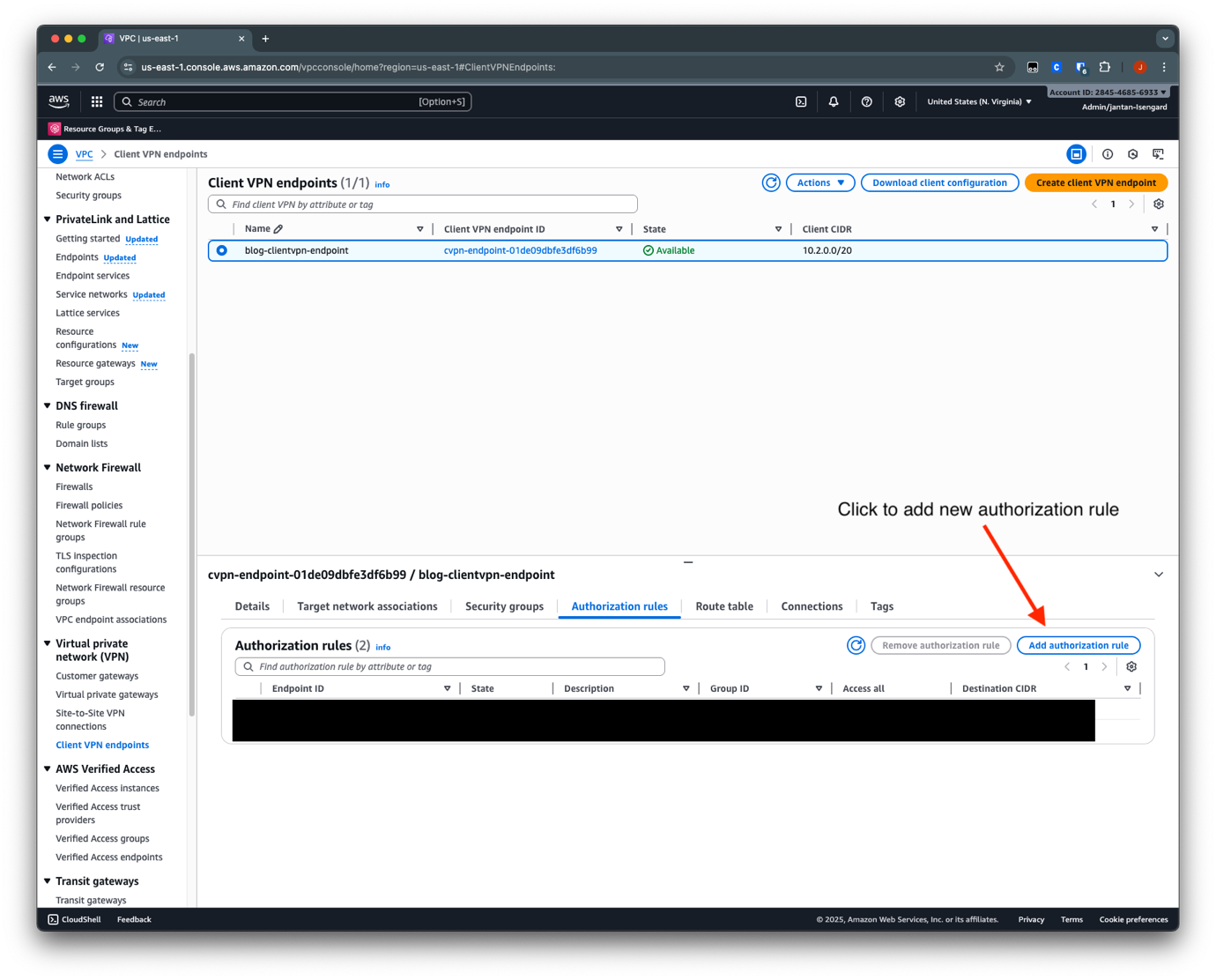 Client VPN エンドポイントの初期セットアップ時に、VPN_users グループが VPN-VPC ネットワーク (10.0.0.0/16) にアクセスすることを認可する認可ルールを定義しました。database-VPC への接続を追加する手順は以下のとおりです。