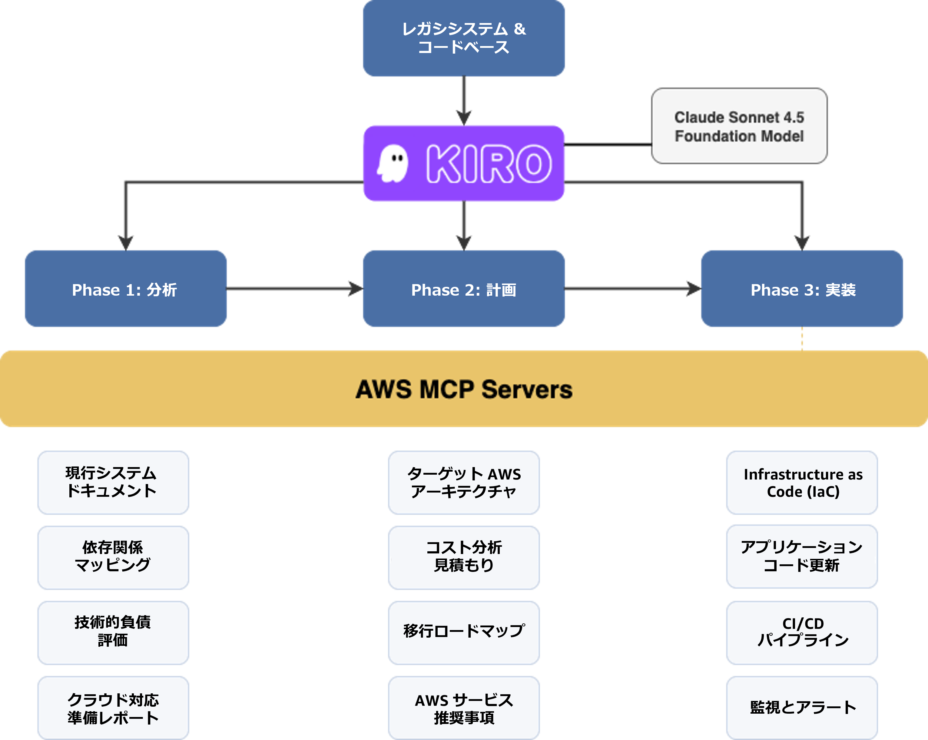 各フェーズは、特定の AWS MCP サーバーと Kiro の機能を活用して、従来は手作業で数週間かかっていたプロセスを、数日で本番環境対応の結果を提供する自動化された一貫性のあるワークフローに変革します。