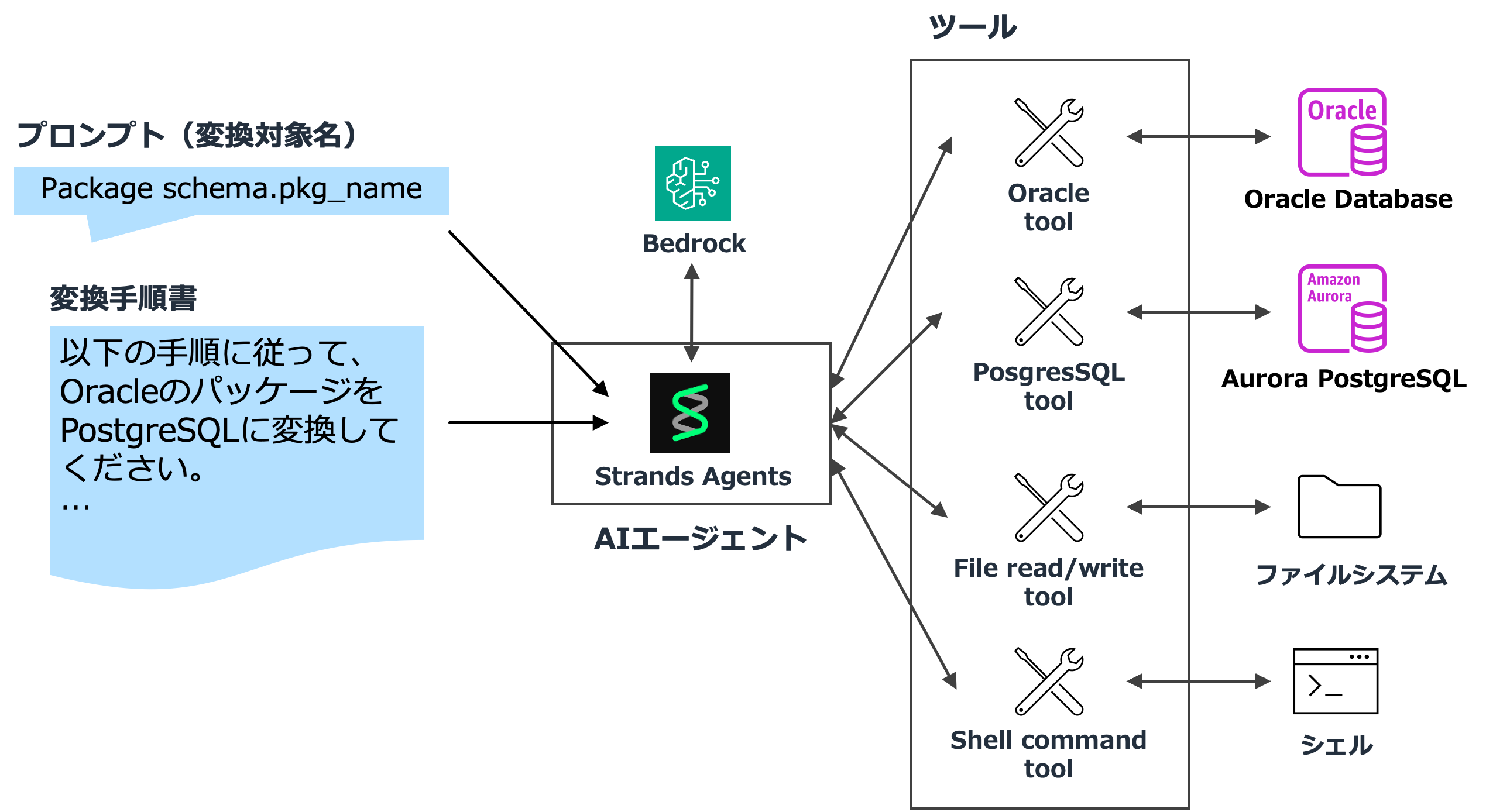 今回私たちが開発したソリューションでは、Strands Agents に実際のデータベース操作や変換作業に必要な具体的なツール群を提供することで、生成 AI によるデータベースオブジェクトの変換を可能にしています。また、コード変換だけでなく、基本的なテストケースの自動生成と結果比較の機能も組み込むことで、変換品質の向上を図っています。