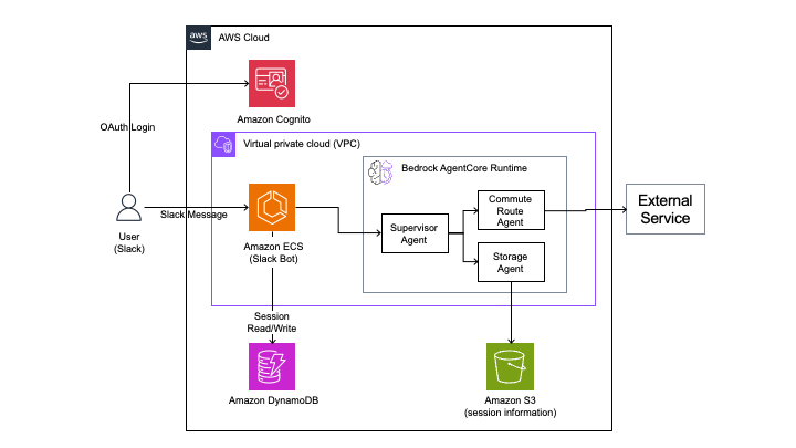 通勤手当エージェントは Slack が呼び出しの起点となるため、呼び出されたタイミングで認証を行い、リクエストに対して適切な各サブエージェントが処理を行う仕組みとなっています。