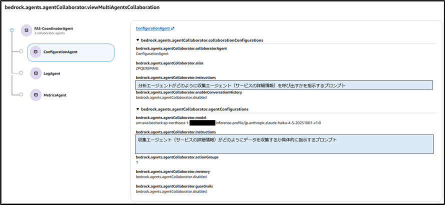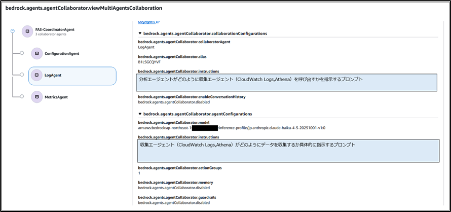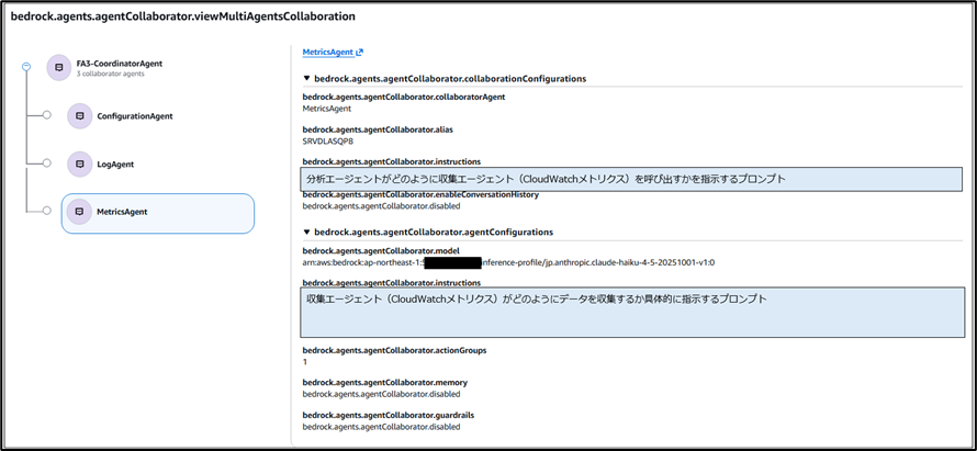 呼び出された Lambda が、DynamoDB から該当アカウントの情報を取得し、受け取ったアラーム情報と組み合わせて、Amazon Bedrock Agents へのプロンプトを生成します。 - 障害調査