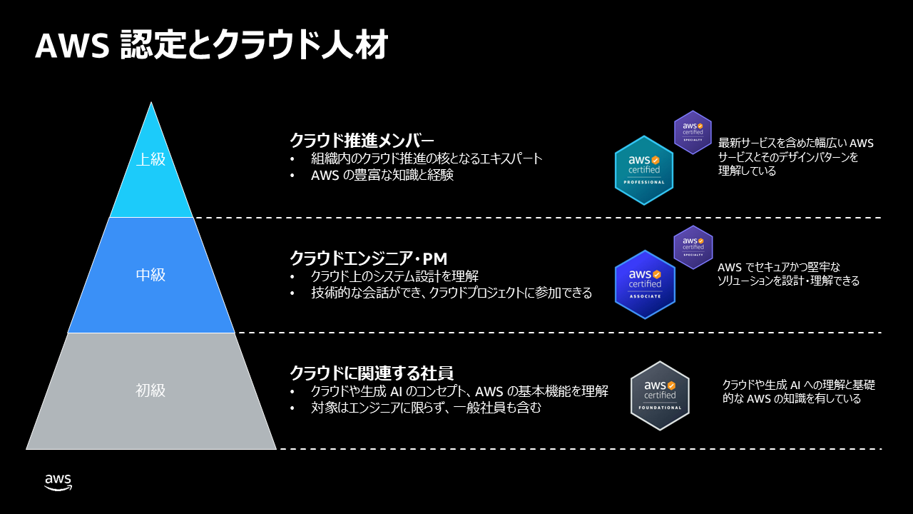 総合商社では、ビジネスの幅広さゆえに AWS 以外にも多くの領域への対応が求められます。また、SIer をはじめとするパートナーとの協業体制の中では、必ずしも自らが深い技術的知識を持たなくても業務を推進できるケースもあります。活用を追及し自ら積極的に技術を学び続けるお二人の姿勢が際立ちました。AWS 認定はエンジニアのための認定という側面がありますが、もう一方ではシステムを利用する方のための認定でもあります。AWS 認定を通して AWS を理解していただき、より効果的に活用いただければと思います。