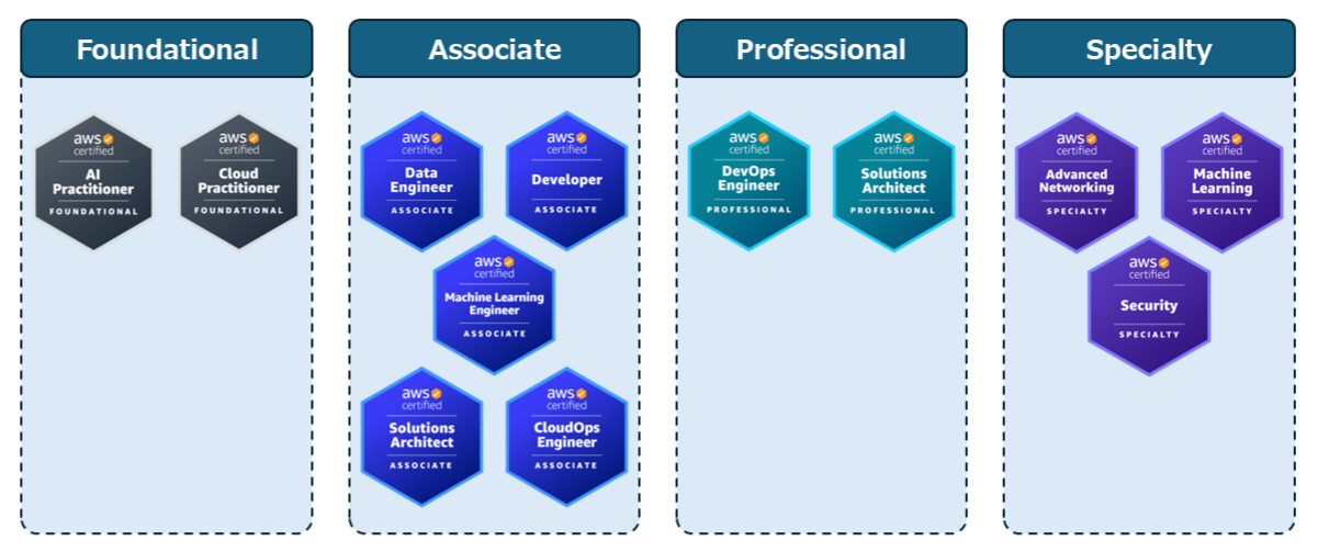 AWS 認定は、AWS が提供するクラウドサービスに関する公式の認定資格制度です。AWS のサービスやクラウドの知識・スキルを証明するもので、エンジニアだけでなく、クラウドに関わるビジネス担当者や IT 職種全般のスキルの証明に活用されています。認定は 4 つのレベルに分かれており、計 12 種類の認定があります(2026 年 3 月時点/ベータ版を除く)。12 種類の認定は「認定の取得パス」として、8 つの系統(アーキテクチャや DevOps、AI/ML など)、それに紐づく16のロール(Solutions Architect、Cloud DevOps Engineer、Data scientist など)をカバーできるようになっています。