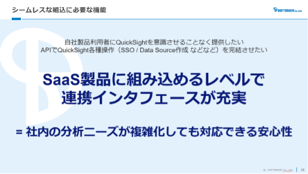 ユーザーからは Amazon Quick を使っていると意識されないレベルでシームレスに統合されているとフィードバックがあるとのこと。また、SaaS に Amazon Quick を組み込めるレベルで豊富なインターフェースが用意されているため、企業が Amazon Quick を単純利用する際にも将来的な拡張に対応できる安心感があると強調されました。