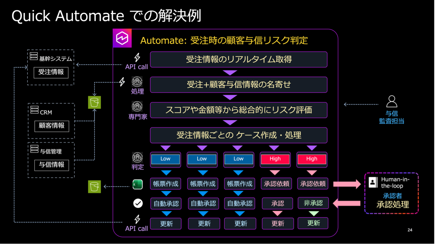 Automate のデモでは、受注時の顧客与信リスク判定を題材に、REST API による基幹システム連携、AI エージェントによる名寄せとリスク評価、構造化アウトプットによる正確なデータ引き継ぎ、そしてリスクレベルに応じた並列処理(ローリスクは自動承認、ハイリスクはヒューマン・イン・ザ・ループで人間が介入)を実演しました。加藤は「まず Flows で小さく始めて、Automate で本格的な自動化にチャレンジしてほしい」とまとめました。