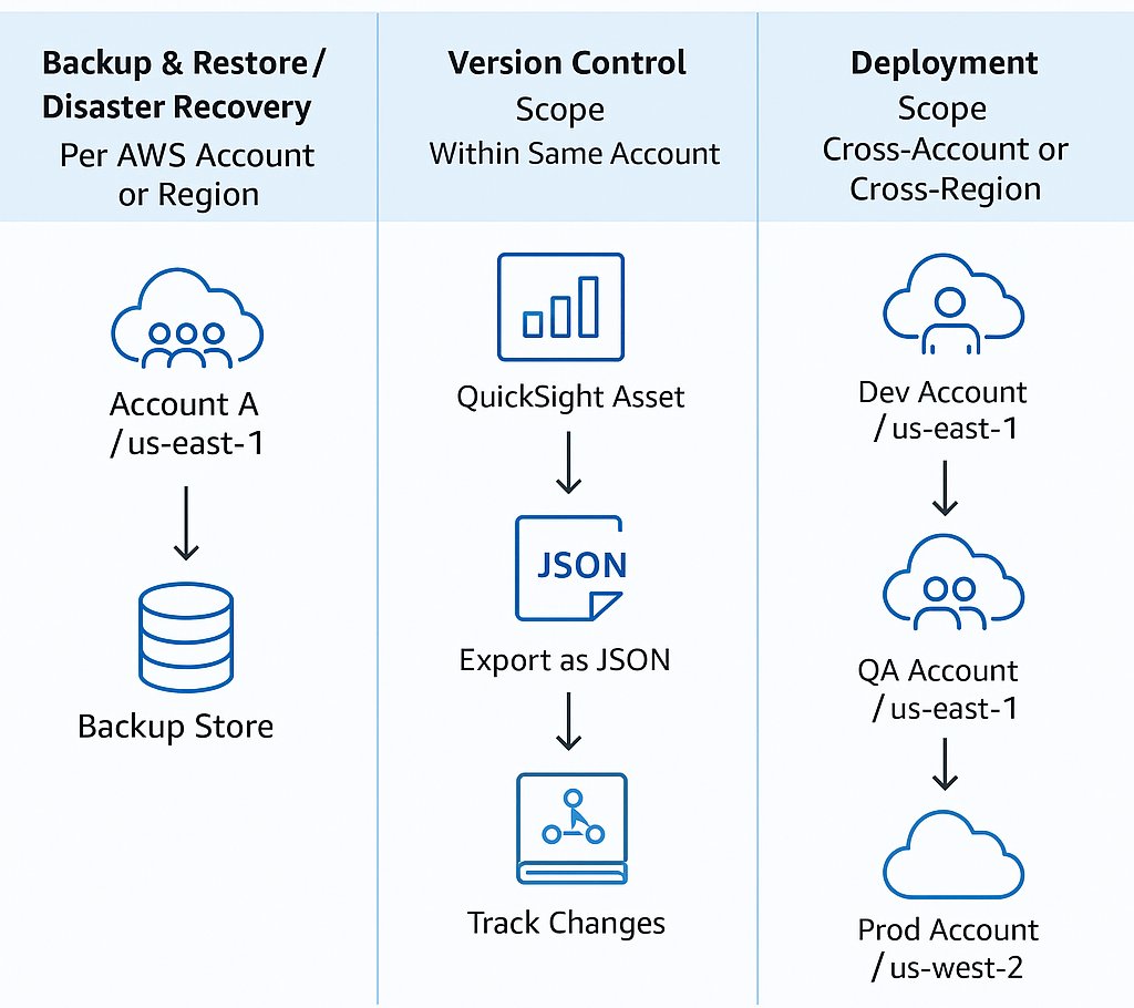 - アセットのバックアップと復元 – これは通常、AWS アカウントごと、または AWS リージョンごとにスコープが設定されます。このプロセスにより、誤った削除、サービスの中断、またはデータの破損が発生した場合に QuickSight アセットを復元できることが保証されます。