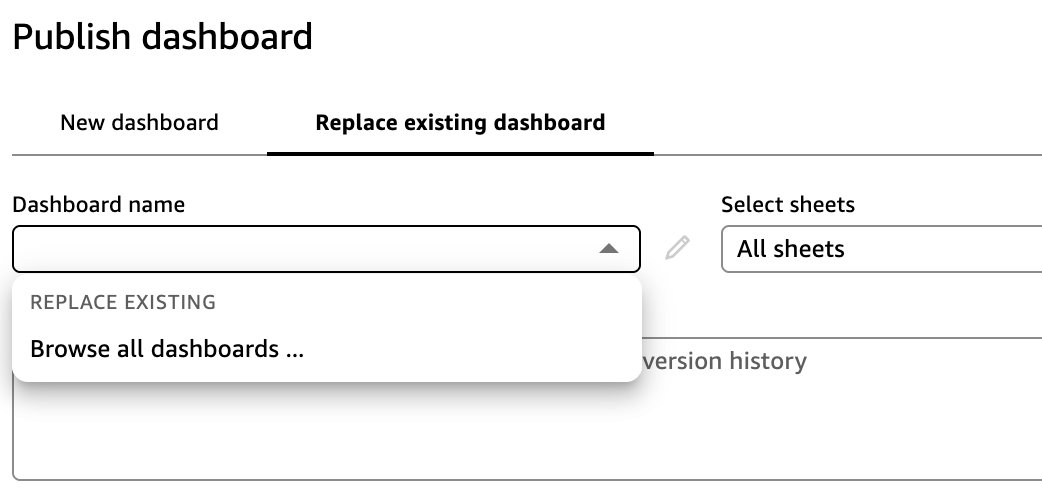 QuickSight で既存のダッシュボードを置き換えるには、公開時に「既存のダッシュボードを置き換える」を選択します。これにより、セキュリティ設定や E メールレポートの設定に影響を与えることなく、ダッシュボードが新しい変更で更新されます。