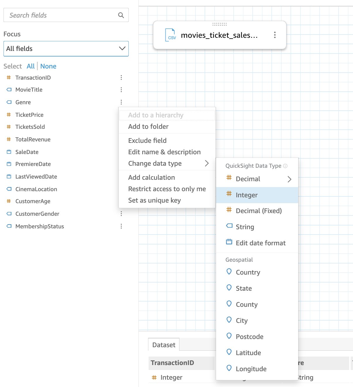 QuickSight のフィールドタイプは、ビジュアル、フィルター、計算がどのように機能するかを決定します。データセットのスキーマ変更が分析の要件と競合すると、ダッシュボードの障害が発生する可能性があります。次のスクリーンショットは、フィルターとビジュアライゼーションのキーフィールドとして SaleDate