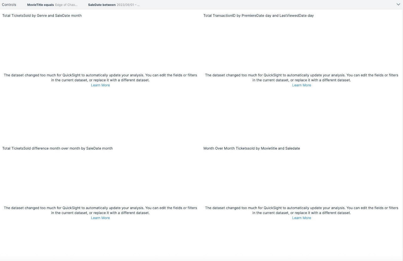に関連付けられたビジュアルを読み込むことに失敗しました。影響を受けた各ビジュアルには、「データセットが変更されすぎたため、QuickSight が分析を自動的に更新できませんでした」というメッセージが表示されました。