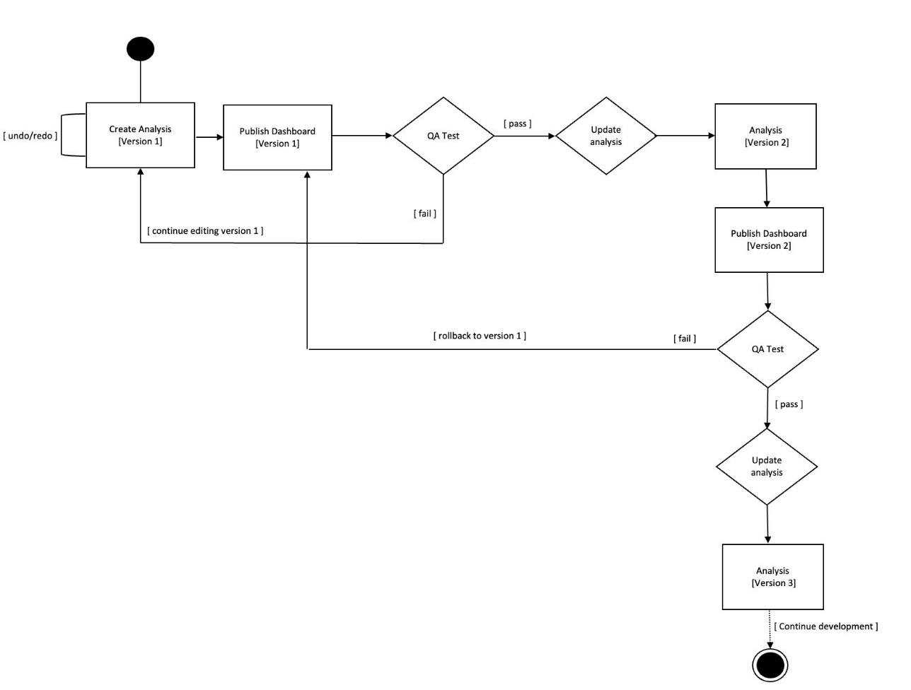 ワークフローは、分析の作成と編集(バージョン 1)から始まり、次にそれをダッシュボードバージョン 1 として公開します。QA テストの後、ダッシュボードが合格すれば、分析はバージョン 2 に更新され、再公開されます。QA テストがどの時点でも失敗した場合、チームは現在のバージョンの編集を続けるか、以前のバージョンにロールバックすることができます。このサイクルは、公開、テスト、更新という反復的な開発を続け、変更が本番環境に到達する前に検証されることを保証します。「元に戻す」「やり直し」アクションは分析内の変更をサポートし、バージョンのロールバックは BI チームの安全性と俊敏性を高めます。