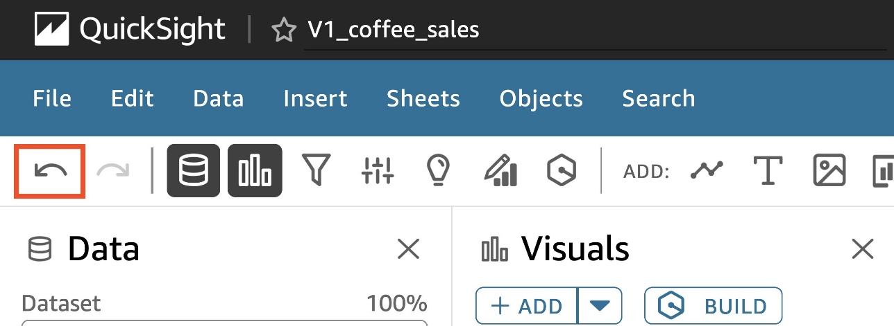 QuickSight で分析を編集する際、作成者は 「元に戻す」および「やり直し」 オプションを使用して、変更が永続的になることを心配せずに実験できます。分析内で最大 200 のアクションを元に戻したり、やり直したりすることができ、ツールバーのアイコン(次のスクリーンショットを参照)を使用してアクセスできます。