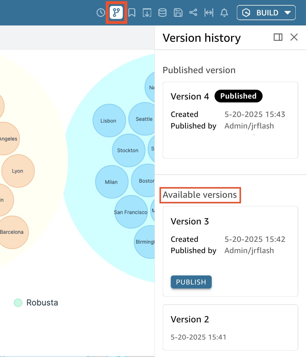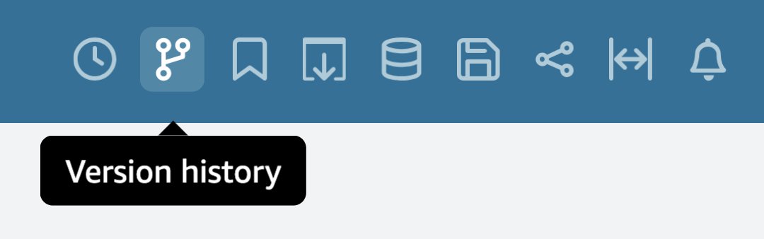 分析がダッシュボードとして公開されると、QuickSight は自動的に新しいバージョンを作成します。ダッシュボードの所有者は、バージョン履歴を表示することでこれらのバージョンを管理できます。そのためには、ダッシュボードを開き、上部ツールバーのバージョン履歴アイコンを選択します(次のスクリーンショットを参照)。
