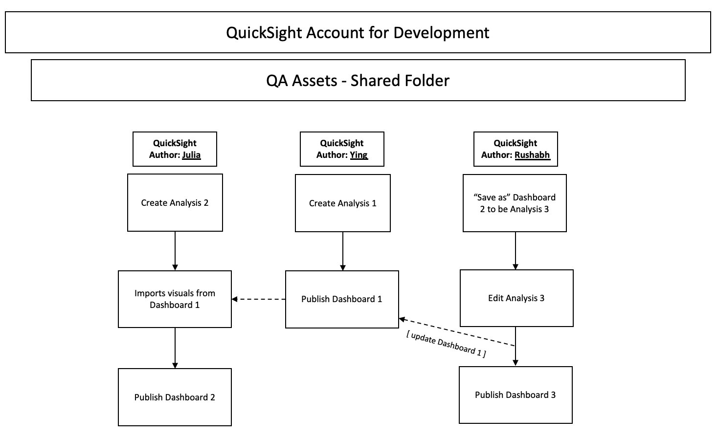 次の図は、単一の QuickSight 開発アカウント内で複数の作成者が並行してコラボレーションする方法を示しています。共有フォルダ「QA Assets」は、再利用可能なコンテンツを一元管理する場所として機能し、作成者はダッシュボードを拡張したり、ビジュアルを再利用したり、バージョンを独立して管理したりできます。