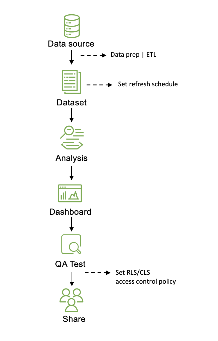 次のグラフに示すように、QuickSight のダッシュボード開発プロセスは、BI 作成者から始まります。BI 作成者は、アクセス管理を簡素化するためにグループにまとめることができます。