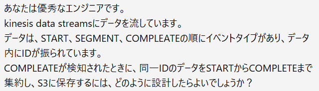 まず開発の起点となるコードの土台を得るために、システムのアーキテクチャと実現したい機能要件をプロンプトとして AI に入力しました。