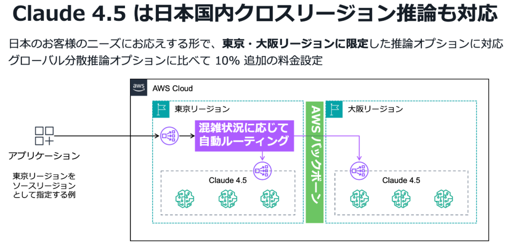 詳しくは、AWS ブログ「Amazon Bedrock で日本国内に閉じた Anthropic Claude 4.5 の推論が可能に!日本国内クロスリージョン推論のご紹介」も参照してください。