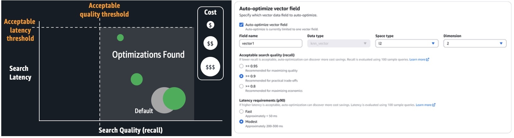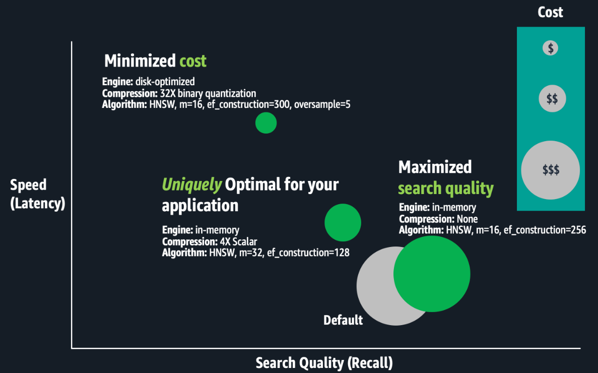 OpenSearch ベクトルエンジンは、検索品質 (再現率)、速度 (レイテンシー)、コスト (RAM 要件) の間で有利なトレードオフを行うのに役立つさまざまなインデックス構成を提供します。普遍的に最適な構成は存在しません。専門家は、Hierarchal Navigable Small Worlds (HNSW) アルゴリズムパラメータ (m や ef_construction など)、量子化技術 (スカラー、バイナリ、プロダクトなど)、エンジンパラメータ (メモリ最適化、ディスク最適化、ウォームコールドストレージなど) の組み合わせを評価する必要があります。構成の違いにより、検索品質で 10% 以上の差、検索レイテンシーで数百ミリ秒の差、またはコスト削減で最大 3 倍の差が生じる可能性があります。大規模なデプロイメントでは、コスト最適化が予算を左右する可能性があります。