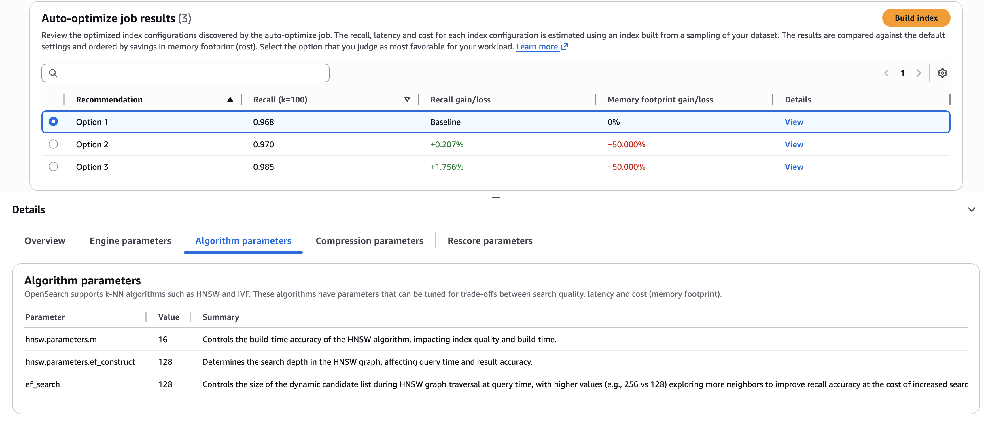 このスクリーンショットは、最適なトレードオフを選択する必要がある例を示しています。最高のコスト削減 (メモリ要件の削減による) を実現する最初のオプションを選択しますか?それとも、1.76% の検索品質向上を実現するが、コストが高くなる 3 番目のオプションを選択しますか?これらの結果を提供するために使用された構成の詳細を理解したい場合は、前のスクリーンショットに示されている Algorithm parameters タブなど、Details ペインのサブタブを表示できます。