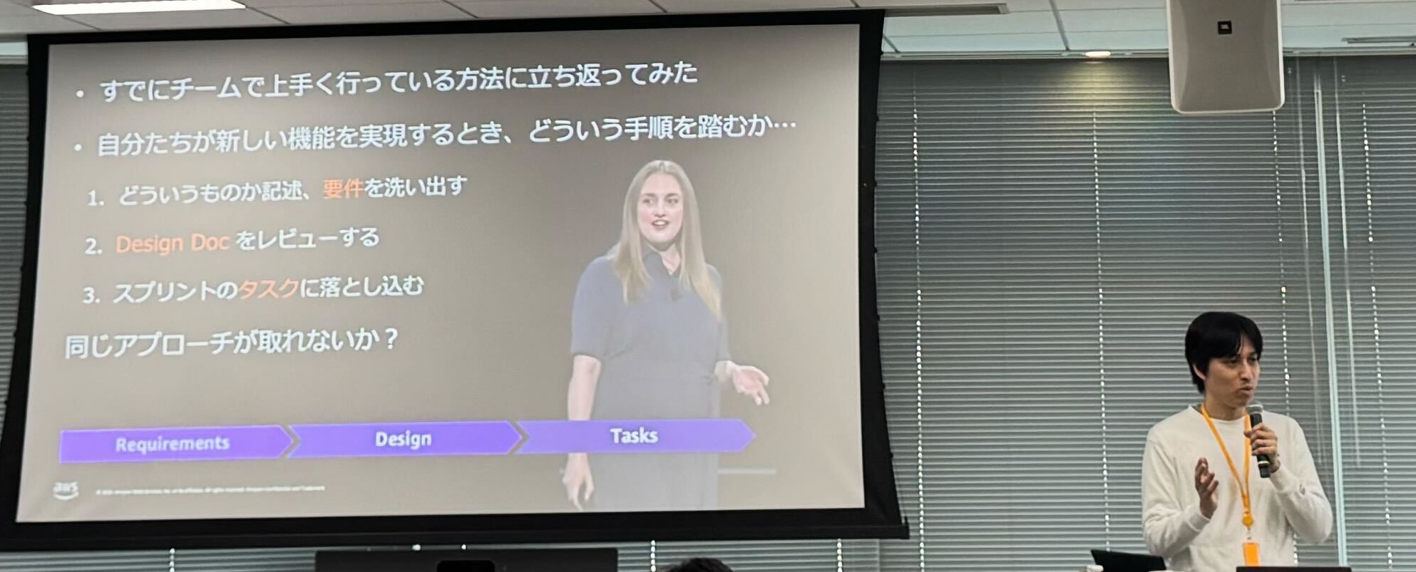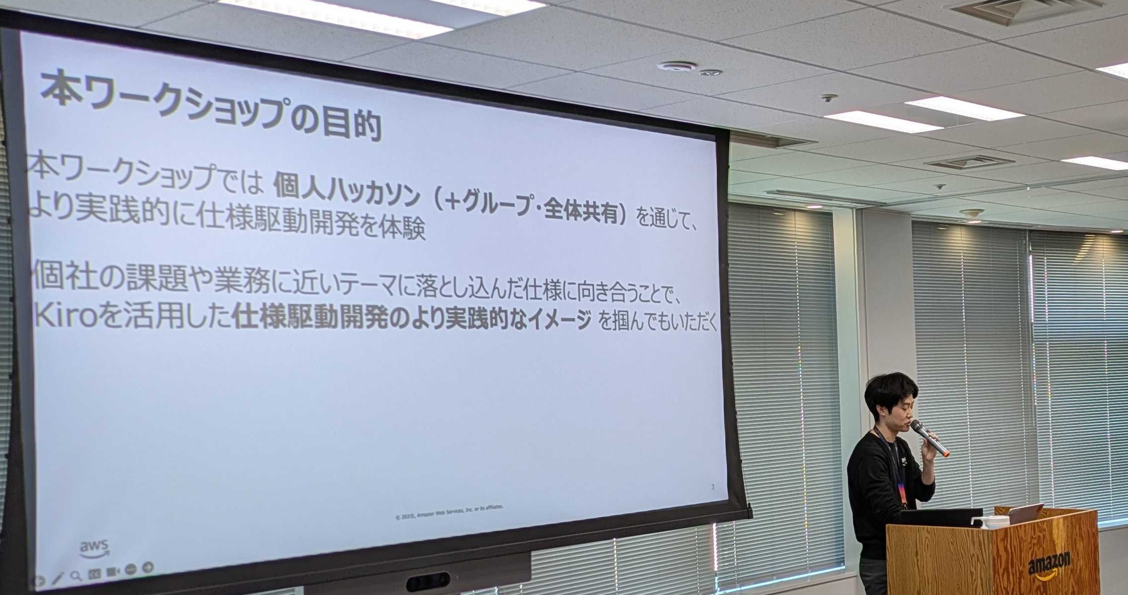 最初のセッションは、ソリューションアーキテクトの濱上より「Kiro — AI と共に考え、共に作る。信頼できる開発パートナー」と題して、Kiro の仕様駆動開発について座学形式でご紹介しました。