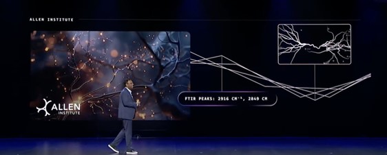 Swami Sivasubramanian のAI基調講演は、Allen Institute の取り組みから始まりました。同研究所が開発した、単一細胞マルチモーダル脳細胞データを解析する高度なニューラルネットワークモデルが紹介されました。Swami は講演の中で、特定の患者アウトカムを予測するモデルの学習や、分子構造とタンパク質相互作用を深く理解する AI モデルの開発など、複数のヘルスケア事例を取り上げました。