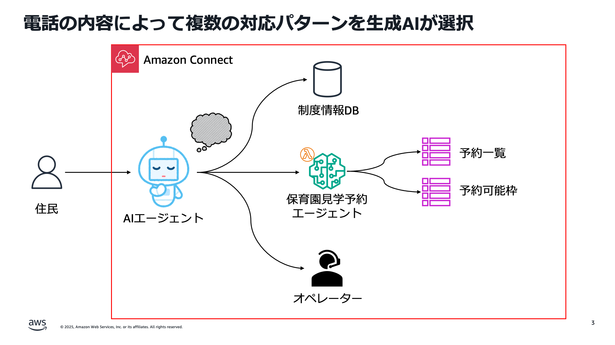 上記課題を踏まえて、今回のデモではお問い合わせをしてきた住民の要望を判別し、情報検索を行って回答したり、データベースアクセスできる予約エージェントに繋いだり、人間にエスカレーションしたりすることができるコールセンターAIを実装しました。