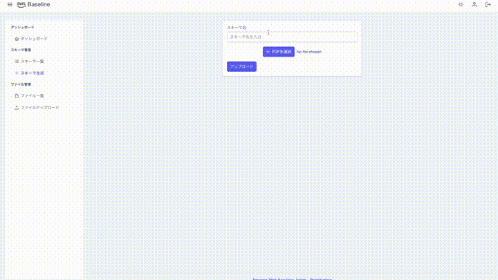 - サンプルファイル(就労証明書の記入例の PDF ファイルなど)からその書類の内容に合った JSON スキーマを生成 AI で自動生成。(JSON スキーマは必要に応じてユーザーが編集可能)