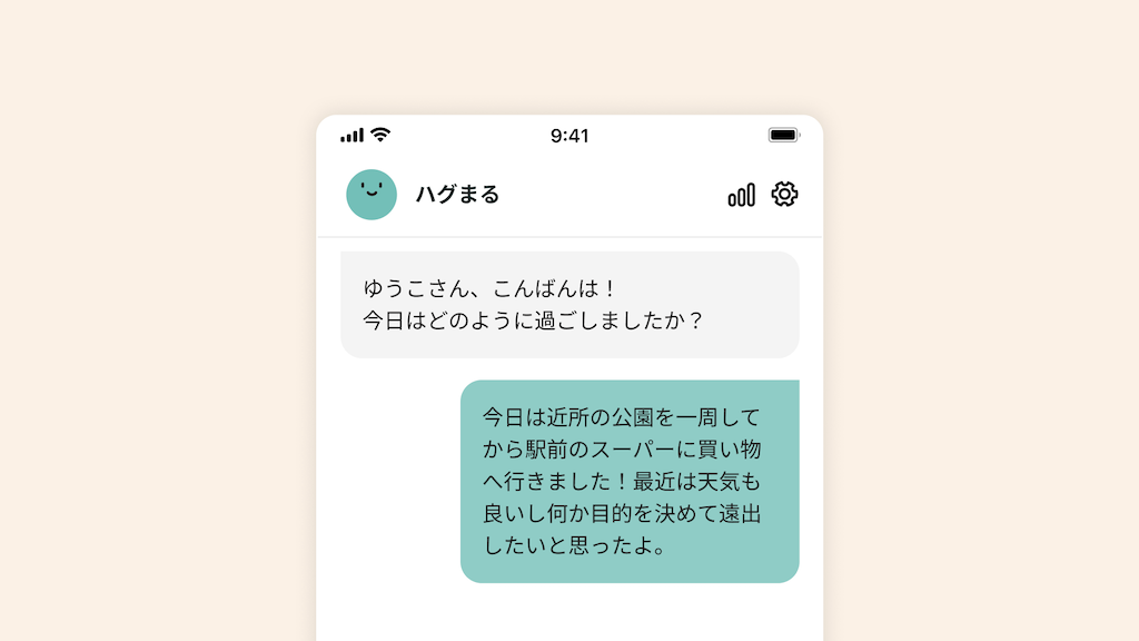 AIパートナー「ハグまる」と日常の出来事や感じたことなど好きなテーマで話す事ができます。AIパートナーがユーザー自身の事や話した内容の一部を覚えて、寄り添った会話が特徴です。話せば話すほどにAIパートナーの「ハグまる」がユーザーの事を理解してくれて、共感し、時には健康に関するヒントや新しい活動を提案します。過去の会話内容も踏まえてパーソナライズされたコミュニケーションを提供し、孤独感の解消やモチベーション維持に繋げます。また、会話の記録はアプリで確認してふりかえる事ができます。