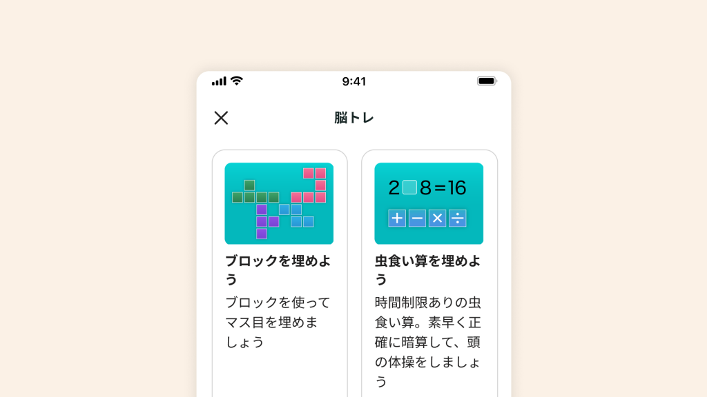 脳トレゲームとしてブレインワークアウトを搭載。計算問題や記憶ゲームなど、スキマ時間に手軽に楽しく取り組める全10種類のゲームです。脳の活性化を促し、認知機能の維持をサポートします。その他にも脳の健康情報サイトである「脳ラボ」と連携し、脳の健康を意識した食事や睡眠、運動などのコンテンツを提供します。
