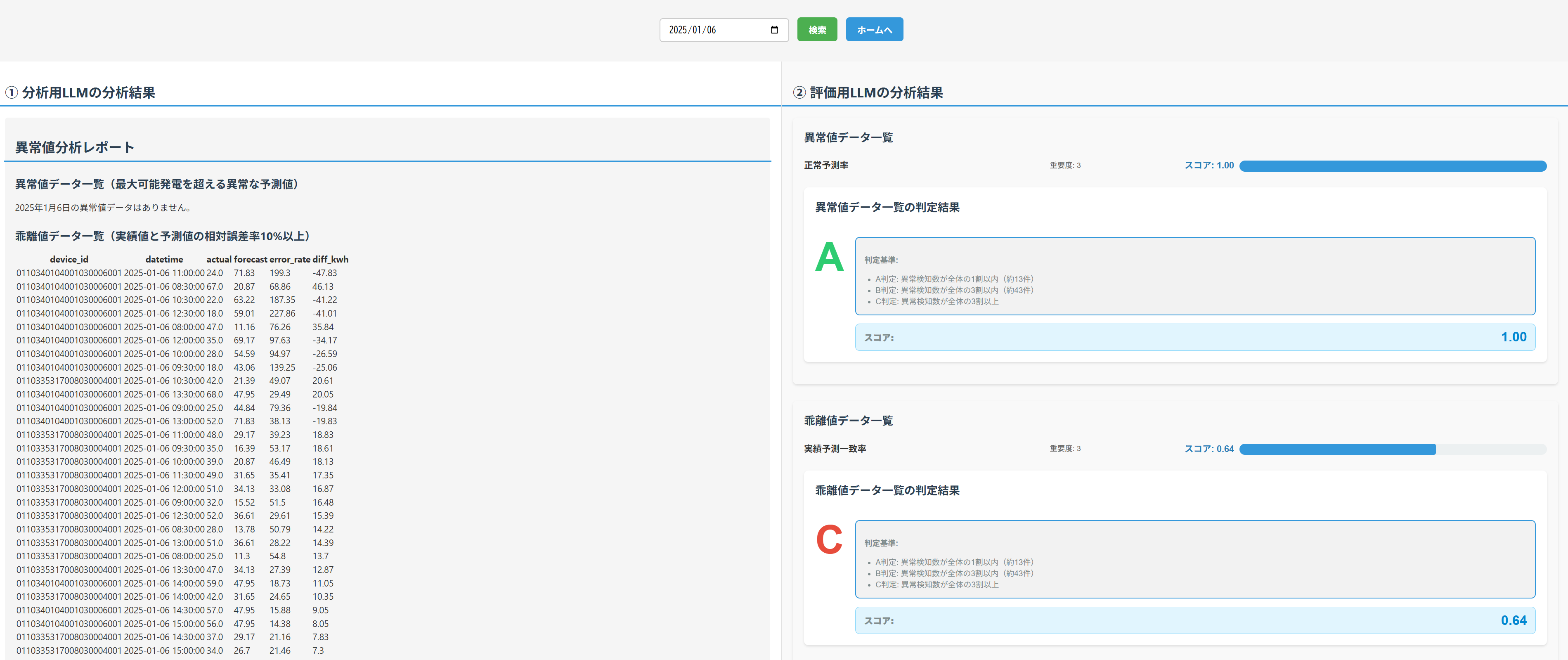 以下は、実際にシステムを動作させた際の画面例です。異常検知の結果とLLM-as-a-Judge 機能による評価結果が統合されたダッシュボードで確認できます。左側には検知された異常データの詳細(デバイス ID、時刻、実績値、予測値、誤差率など)が表示され、右側には異常値分析と乖離値分析それぞれについて A〜C 評価とスコアが表示されます。