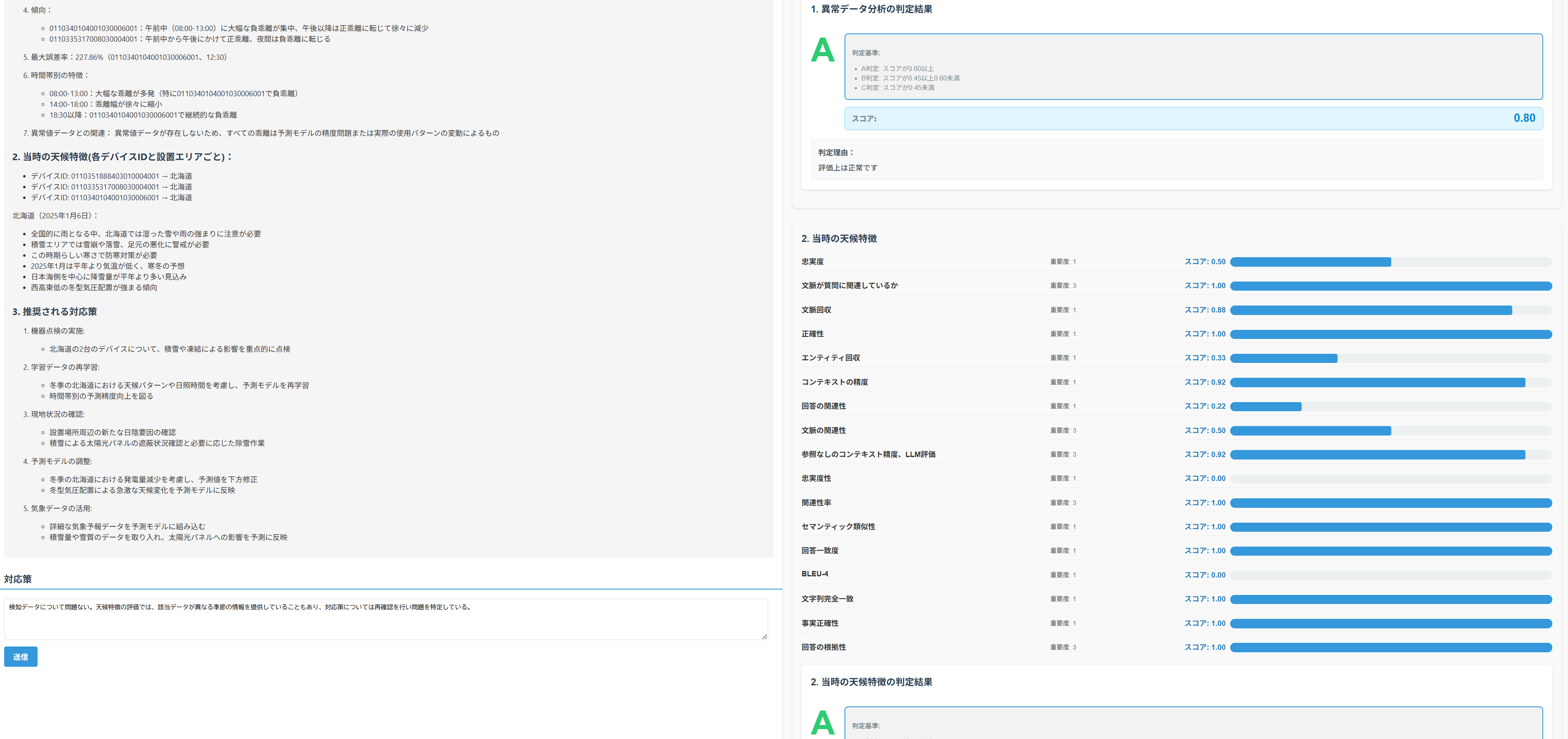 また、RAGAS 評価の詳細画面では、忠実度、コンテキスト精度、回答関連性などの各評価指標について、重要度とスコアが可視化されており、ユーザーは分析結果のどの部分を重点的に確認すべきかを把握できます。RAGAS 評価では、各 Lambda がそれぞれ異なる質問(異常値抽出、対応策検討、原因分析)を LLM に 2 回投げ、1 回目の回答を Ground Truth(想定回答)とし、2 回目の回答と比較することで評価を実施しています。通常、RAGAS 評価では人間が作成した正解データを Ground Truth として使用しますが、太陽光発電異常分析のような専門性の高い領域では、事前に決まりきった正解を用意することが困難なため、LLM 自身に Ground Truth を生成させる手法を採用しました。これにより、コンテキスト精度(適切な資料を取得できたか)、忠実度(取得した情報に基づいて回答しているか)、回答関連性(質問に適切に答えているか)などの指標を定量的に測定し、RAG システムの検索精度と生成品質を客観的に評価できています。なお、最終的な品質保証は人間による確認と組み合わせることで信頼性を担保しています。