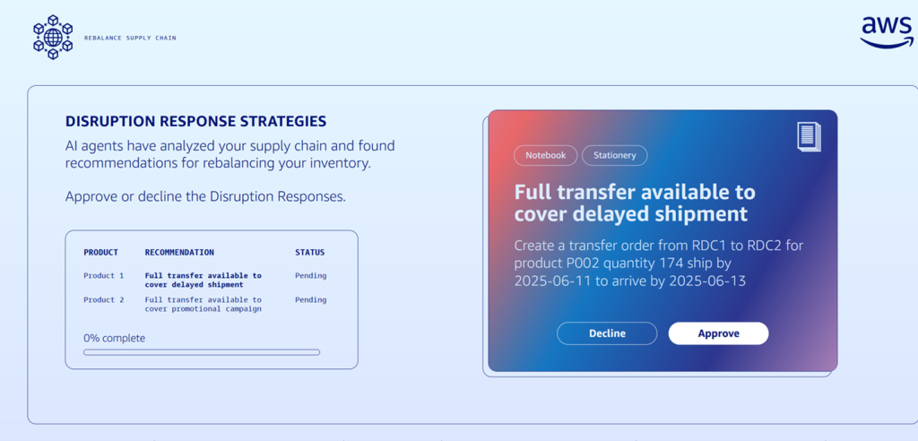 図2は、マルチエージェントアプリケーションによって特定された具体的な混乱への対応の戦略を表示しています。2つの推奨事項が示されており、1つは港湾閉鎖によって遅延する出荷をカバーするために利用可能な在庫の完全な移転です。2つ目の推奨事項は、今後のプロモーションキャンペーンをカバーするための追加の移転の提案です。図は、提案された戦略を承認または拒否するオプションも示しており、人間のドメイン・エキスパートがプロセスに依然として関与していることを示しています。