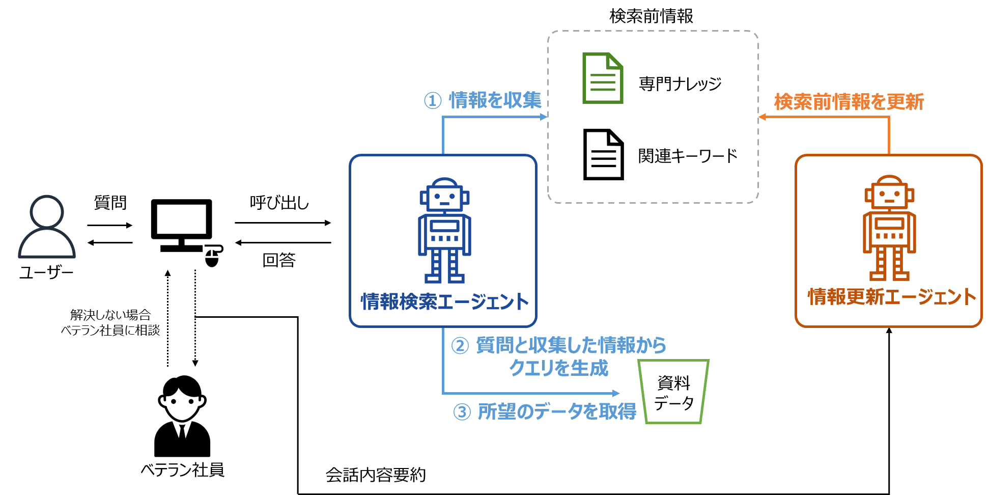 - 知的資産の継続的な進化:情報更新エージェントにより、調査結果や研究知見、最新情報が体系的に整備・自動更新され、戦略的に活用できる基盤が構築されます