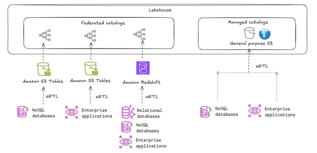Amazon SageMaker のレイクハウスアーキテクチャにおけるストレージパターンの選択ガイドです。データレイク (汎用 S3、S3 Tables) とデータウェアハウス (Redshift Managed Storage) の特性を比較し、ETL、Zero-ETL、データフェデレーションなどのデータ取り込みパターンとともに、ユースケースに応じた最適なアーキテクチャの選択方法を解説します。