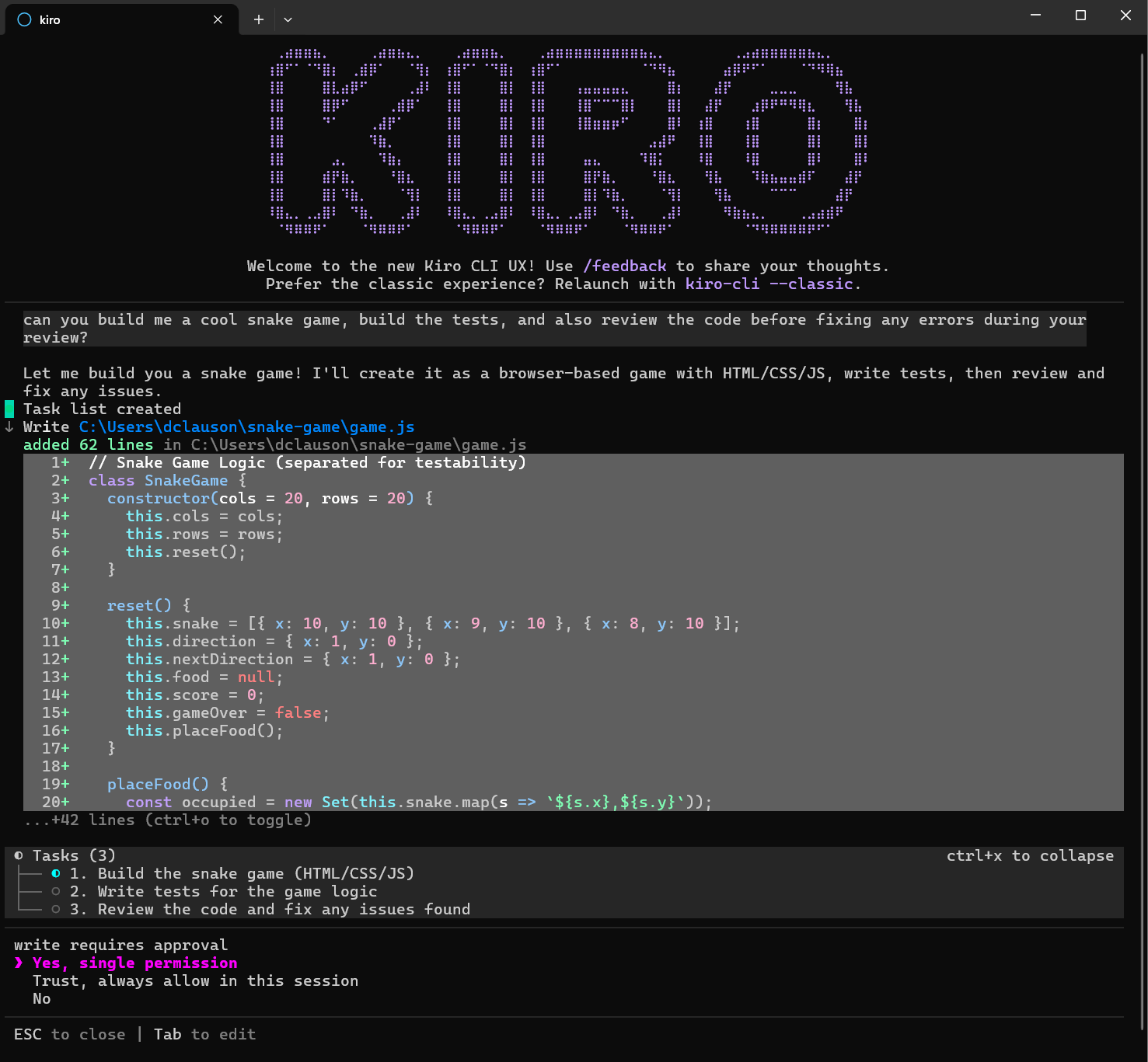 以上のように、Kiro は新しいサブエージェント体験と新しいタスクリスト体験の両方を使ってスネークゲームを構築しました。ぜひ試してみて、サブエージェントとタスクリストがどのように機能するか確認してください。ユースケースが複雑になるほど、タスクリストの価値を実感できるでしょう。Kiro が何を達成したかをすぐに把握できます。